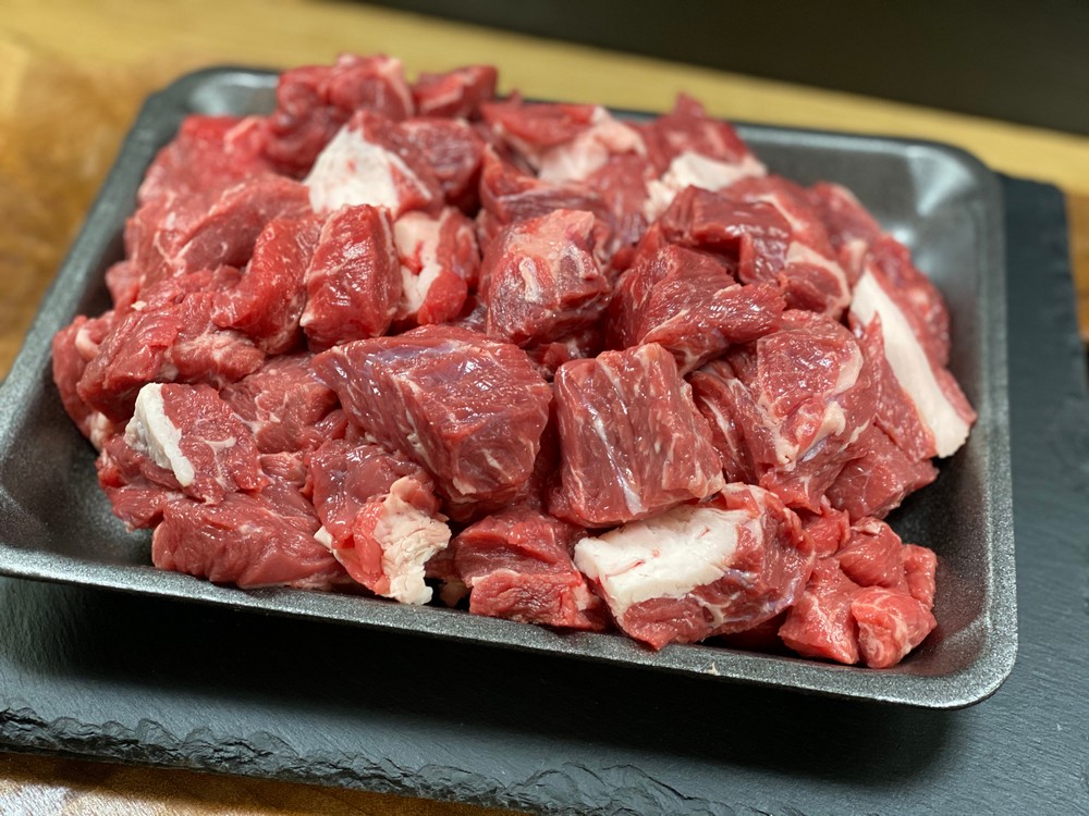 Richly marbled and flavourful. Cut for stews.