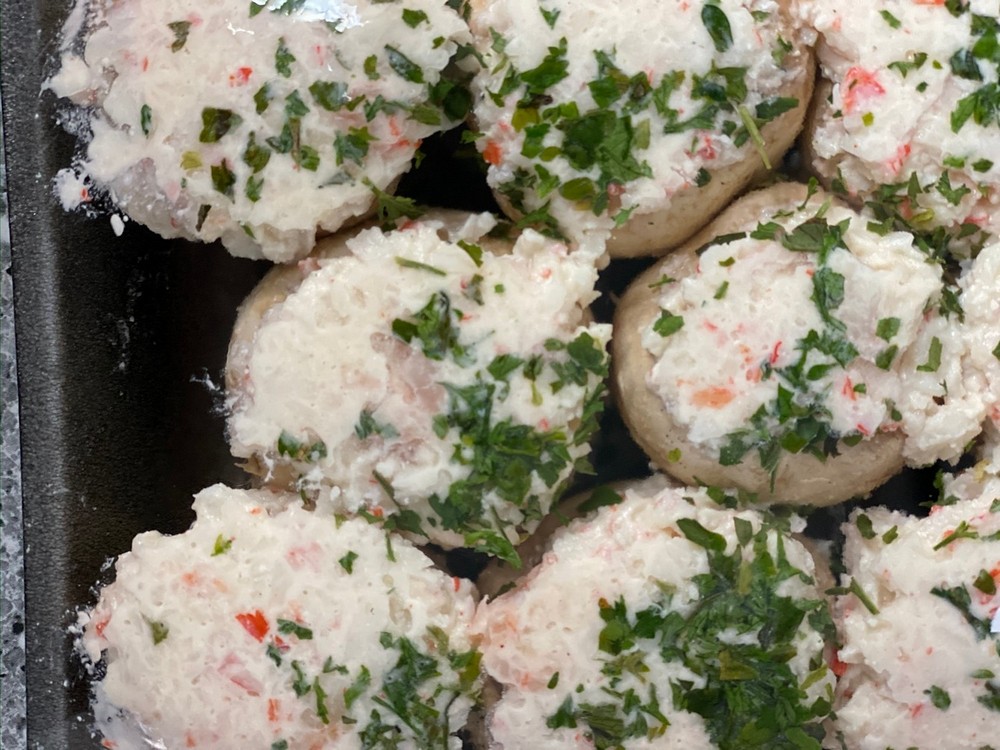 Made in house, creamy imitation crab & shrimp filling in button mushrooms.