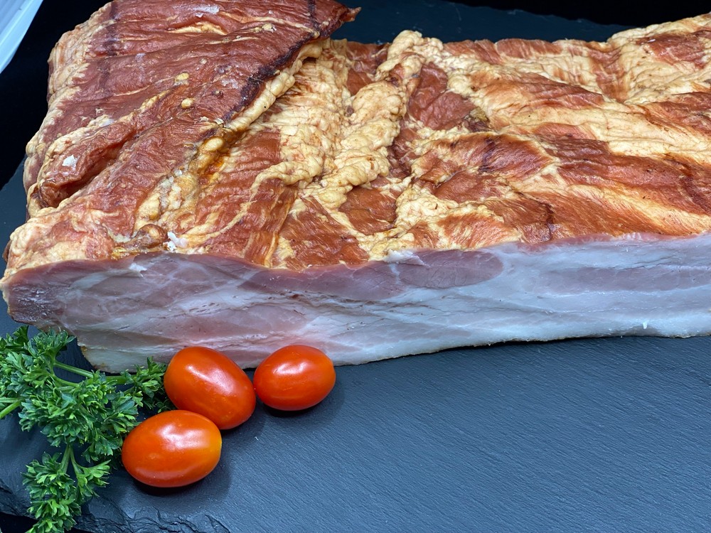 Cured and double smoked in house, rind on.