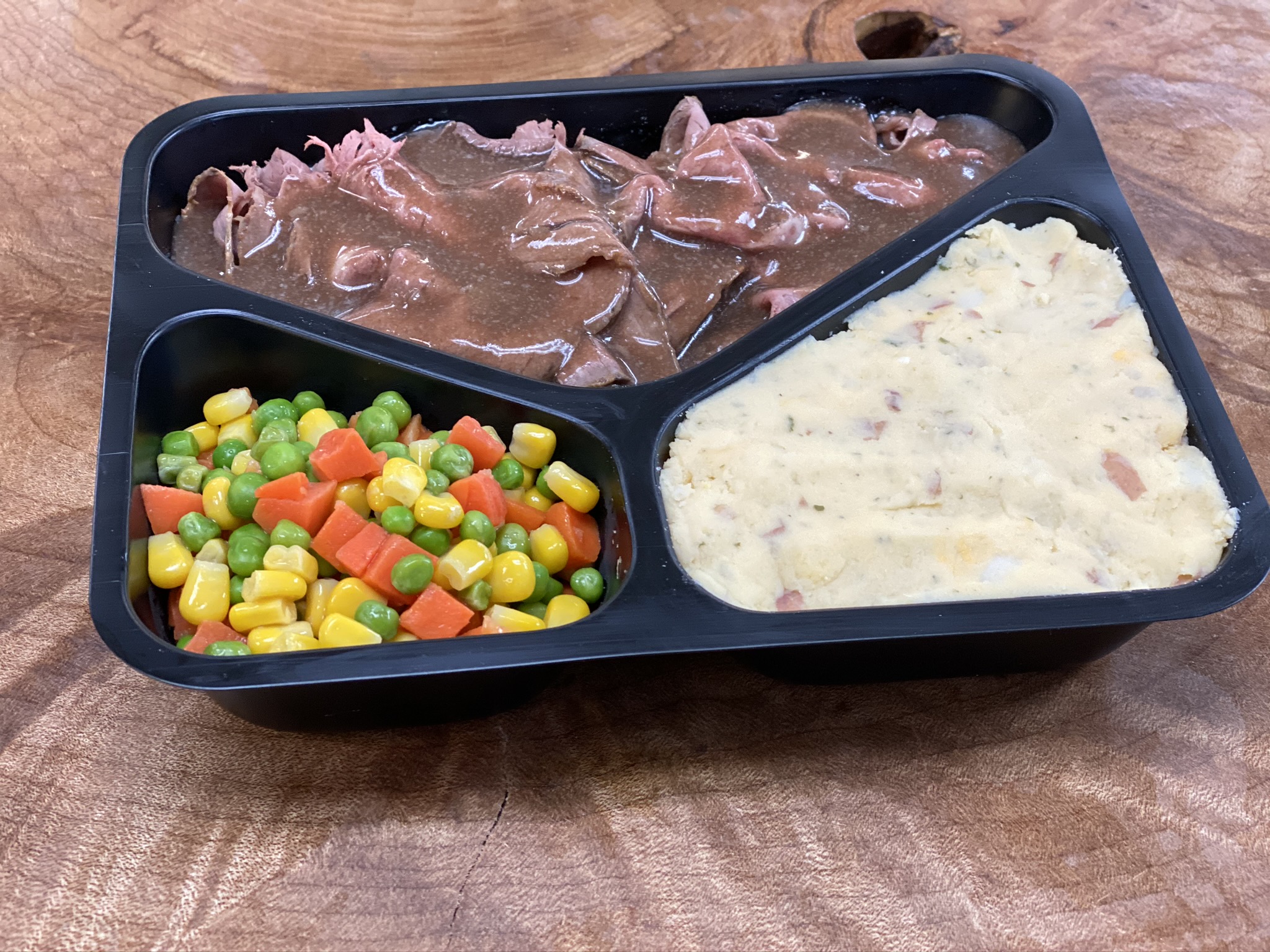 Glenwood’s Roast Beef slices with house made Beef Gravy, Cheesy Garlic Mash Potatoes, peas, carrots and corn. Heat and serve.