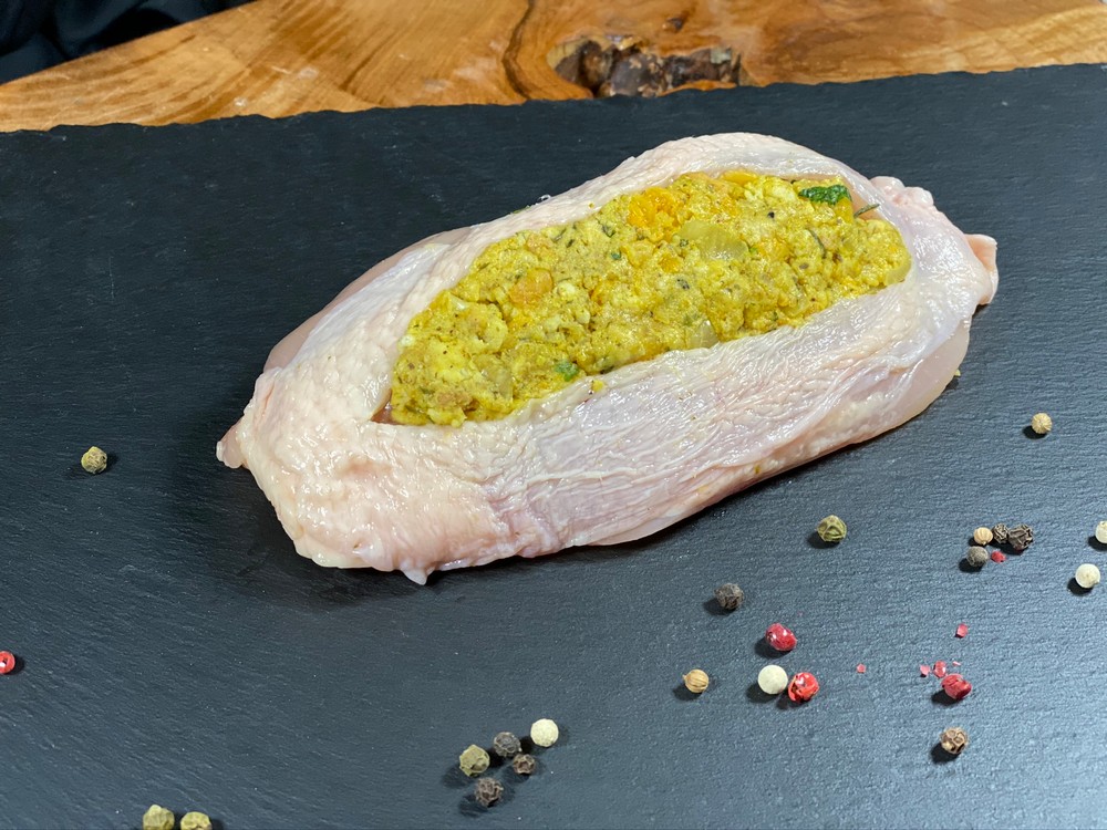 A single skin on chicken breast stuffed with our house made Apricot Curry Stuffing: Breadcrumbs, Onion, Apricots, Curry Powder, Parsley, Orange Juice and Garlic.. Sweet with a touch of spice.