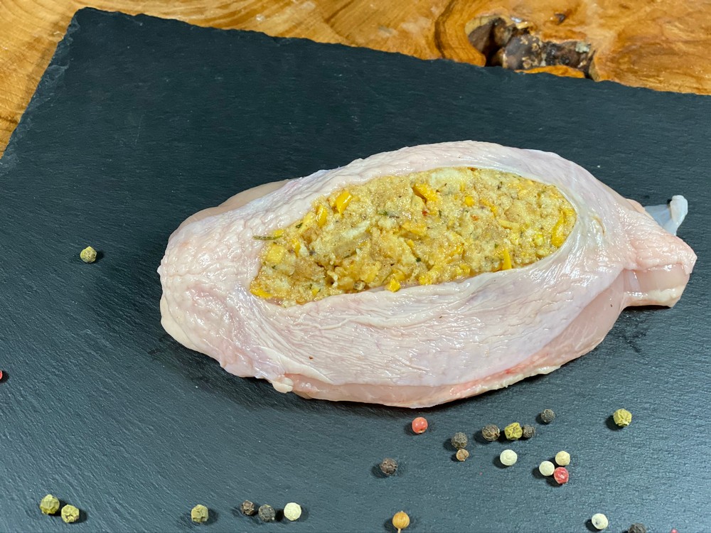 A single skin on chicken breast stuffed with our house made Red Pepper Stuffing: Breadcrumbs. Red Pepper Jelly, White Cheddar and Garlic.