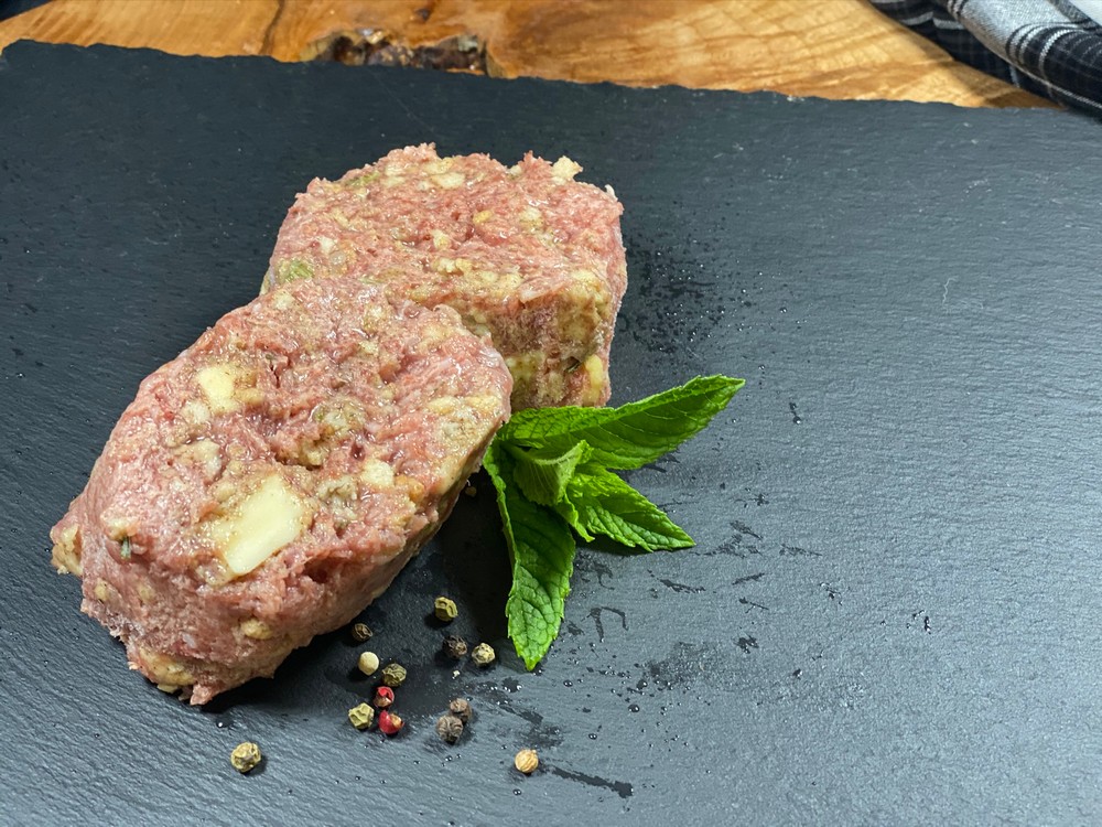 Ground turkey mixed with our house made Apple and Brie Stuffing: breadcrumbs, apple slices, apple sauce, cinnamon and brie cheese. Available frozen 2 per package.
