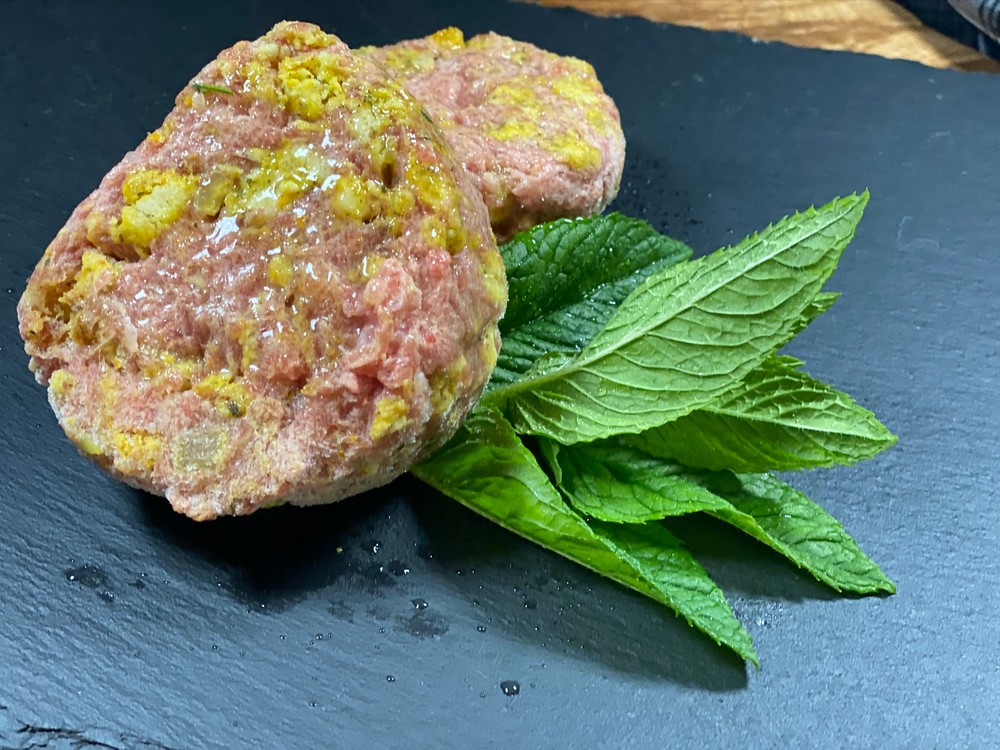 Lean ground turkey mixed with our house made Apricot Curry Stuffing: Breadcrumbs, Onion, Apricots, Curry Powder, Parsley, Orange Juice and Garlic.. Sweet with a touch of spice. Available frozen in packages of 2.