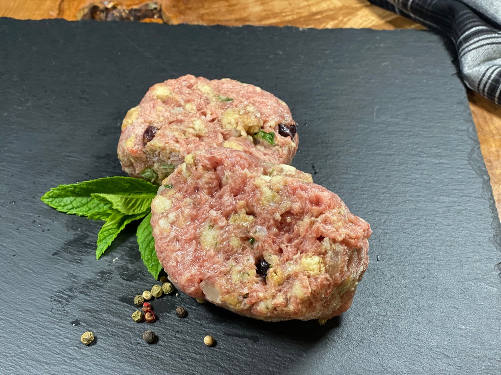Lean ground turkey thigh mixed with our house made Old Fashion Stuffing: breadcrumbs, celery, onions, parsley, dried cranberry and a pinch of garlic. Christmas burger! Flatten the patties before you cook them, then add to a brioche bun with some cranberry mayo, maybe some house made poultry gravy too?