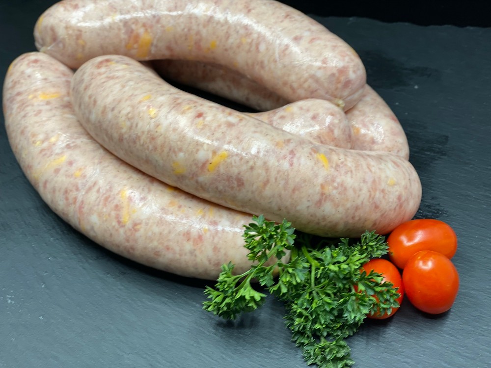 Our house made Bratwurst and Cheddar sausages are made in dinner size natural hog casings, approximately 4 per pound.