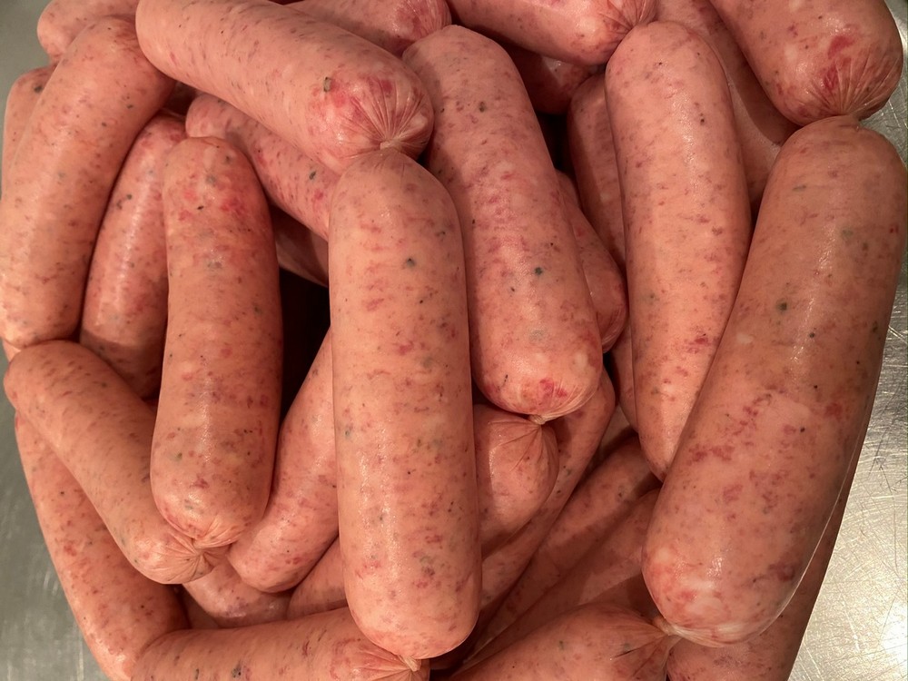 Our house made Pepper Garlic sausages are made in dinner size casings, approximately 6 per pound. Fresh pork and beef, garlic and crushed peppercorns. Gluten Free.